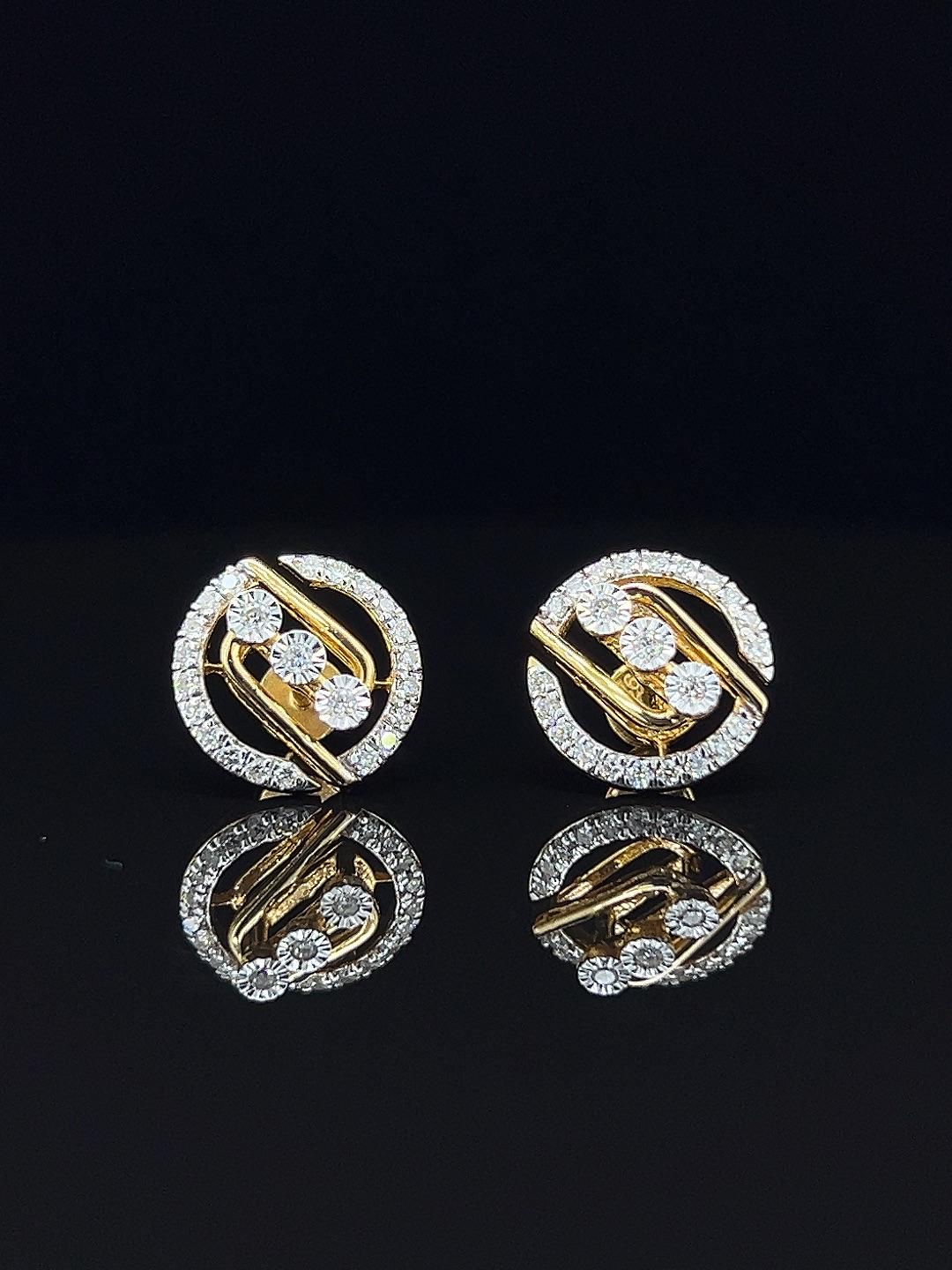 Celeste Circles diamond studs bring modern artistry to classic forms, blending sweeping golden strands with glimmering diamond accents and a pavé-set circular halo. Each earring displays an intricate composition of textured gold, intersected by brilliant diamonds that capture starlight from every angle. The surrounding diamond-studded halo adds depth and extra shimmer, creating a lively, eye-catching effect suited for festive occasions, special evenings, or stylish daily wear. Their bold yet elegant design ensures comfort and easy pairing with ethnic and contemporary outfits alike, making these earrings a treasured statement accessory for the sophisticated collector. Celeste Circles deliver radiant luxury, dynamic movement, and timeless appeal.