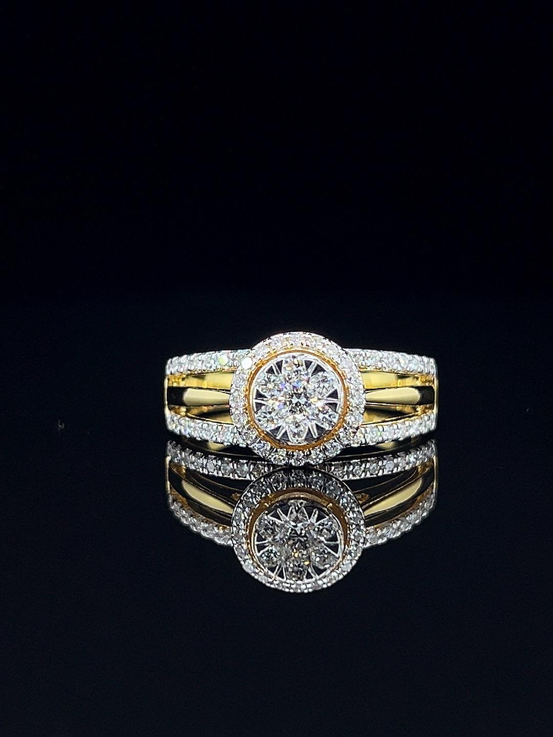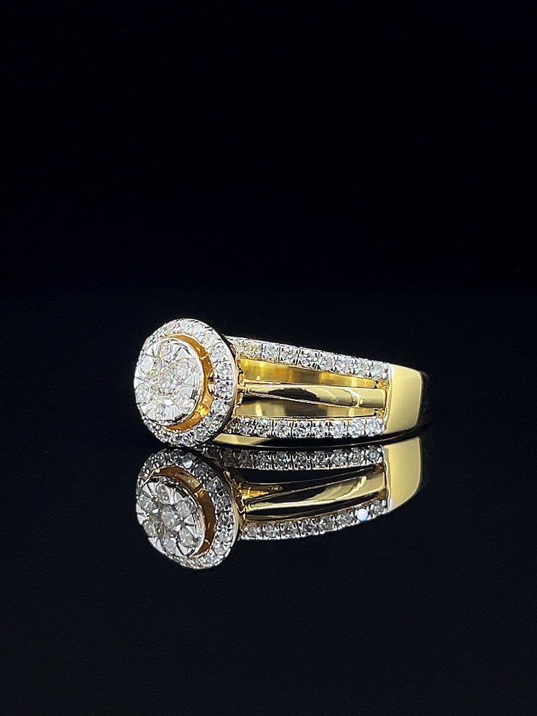 Crown Radiance diamond ring in gleaming gold, showcasing a dazzling cluster center and halo setting with pavé diamond bands—an elegant choice for regal occasions and everyday luxury.