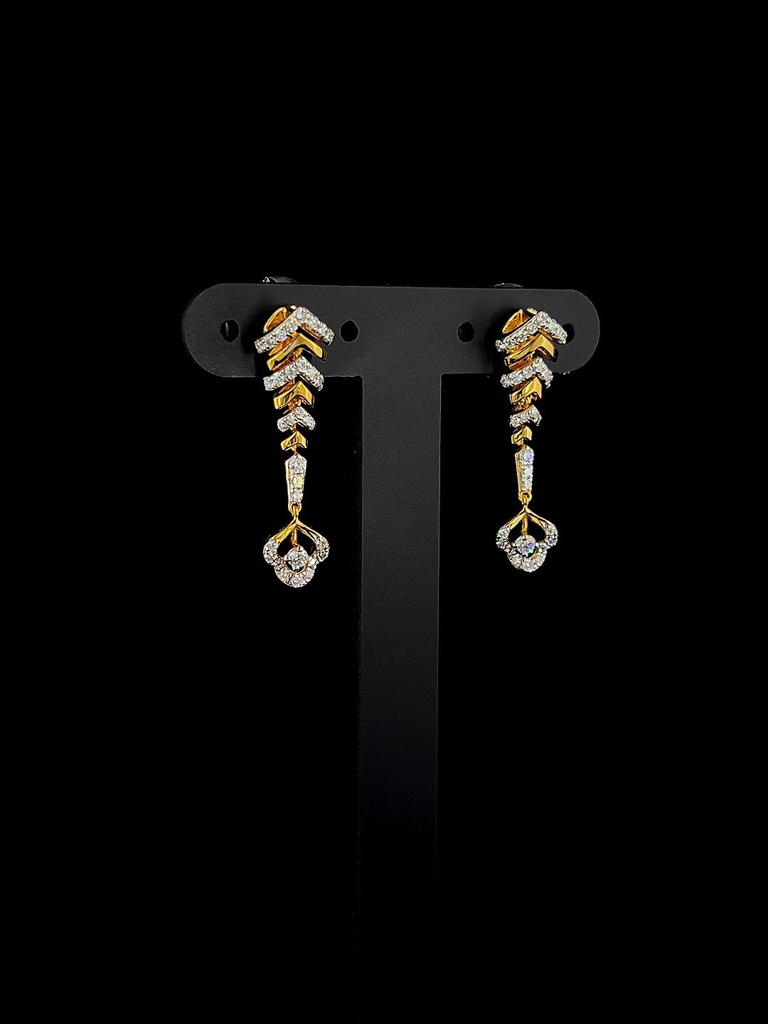 Dewfall Arrows diamond earrings blend dynamic geometry and delicate detail, with cascading chevron-shaped arrows crafted in gleaming gold and accented by pavé diamonds. The design culminates in an intricate drop, reminiscent of dewdrops glistening on foliage, adding subtle motion and extra sparkle. These earrings are lightweight and refined, making them ideal for festive occasions, evening outings, or stylish everyday ensembles. Their structured form and brilliant finish highlight contemporary artistry, while the inventive silhouette allows for effortless pairing with ethnic or modern outfits. Dewfall Arrows earrings offer elegance and versatility for those who appreciate bold forms and delicate luxury.