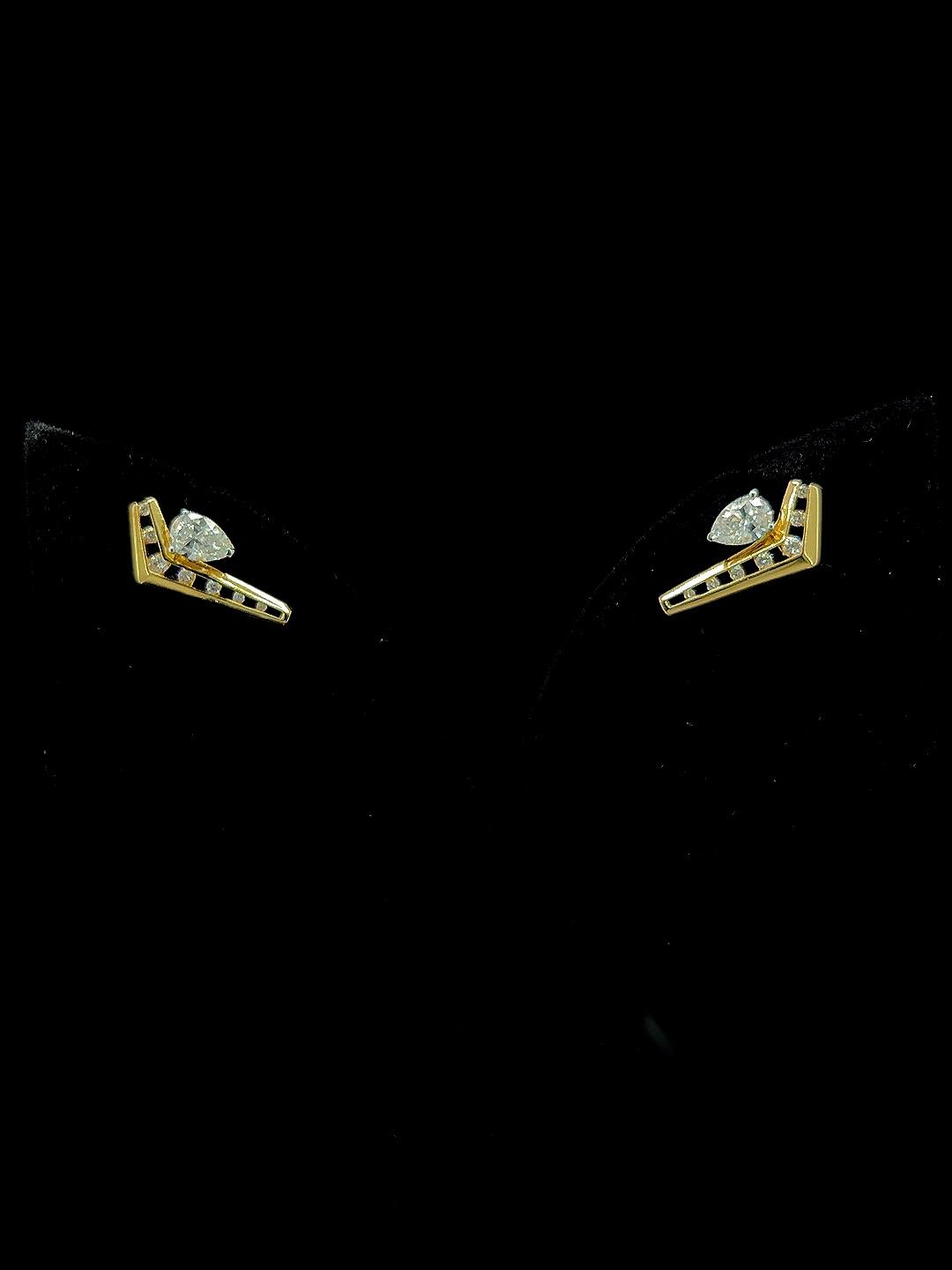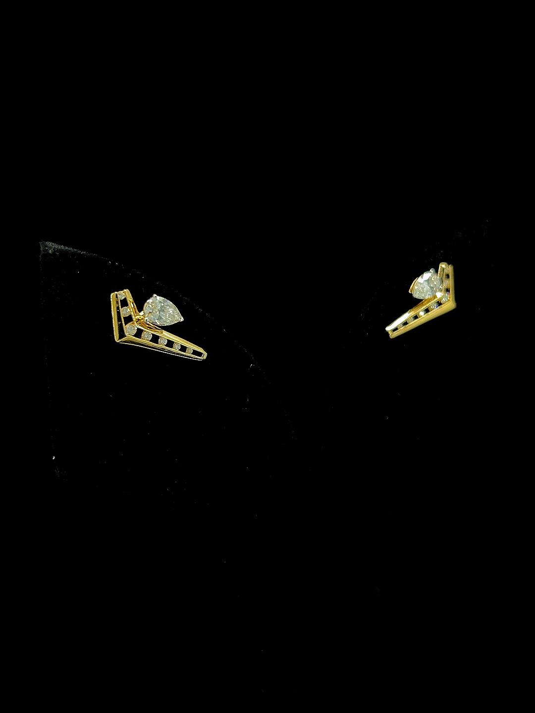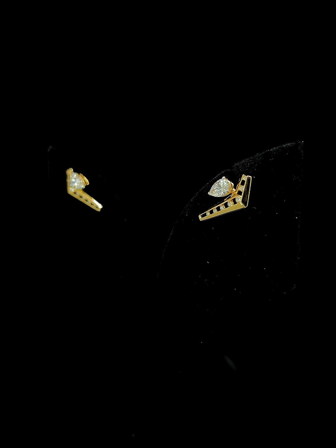 - Dot Drop diamond earrings bring architectural elegance to fine jewelry with their minimalist V-shaped gold structures. Each earring showcases a line of dazzling round diamonds inset along the open frame, culminating in a luminous pear-cut diamond at the apex for a bold statement. The playful geometry and streamlined motif ensure lightweight comfort and easy pairing with both contemporary and ethnic outfits, making these earrings ideal for parties, celebrations, or stylish daily wear. Their inventive silhouette and sparkling accents offer a distinctive look, blending modern sophistication with classic luxury for those who seek standout accessories.