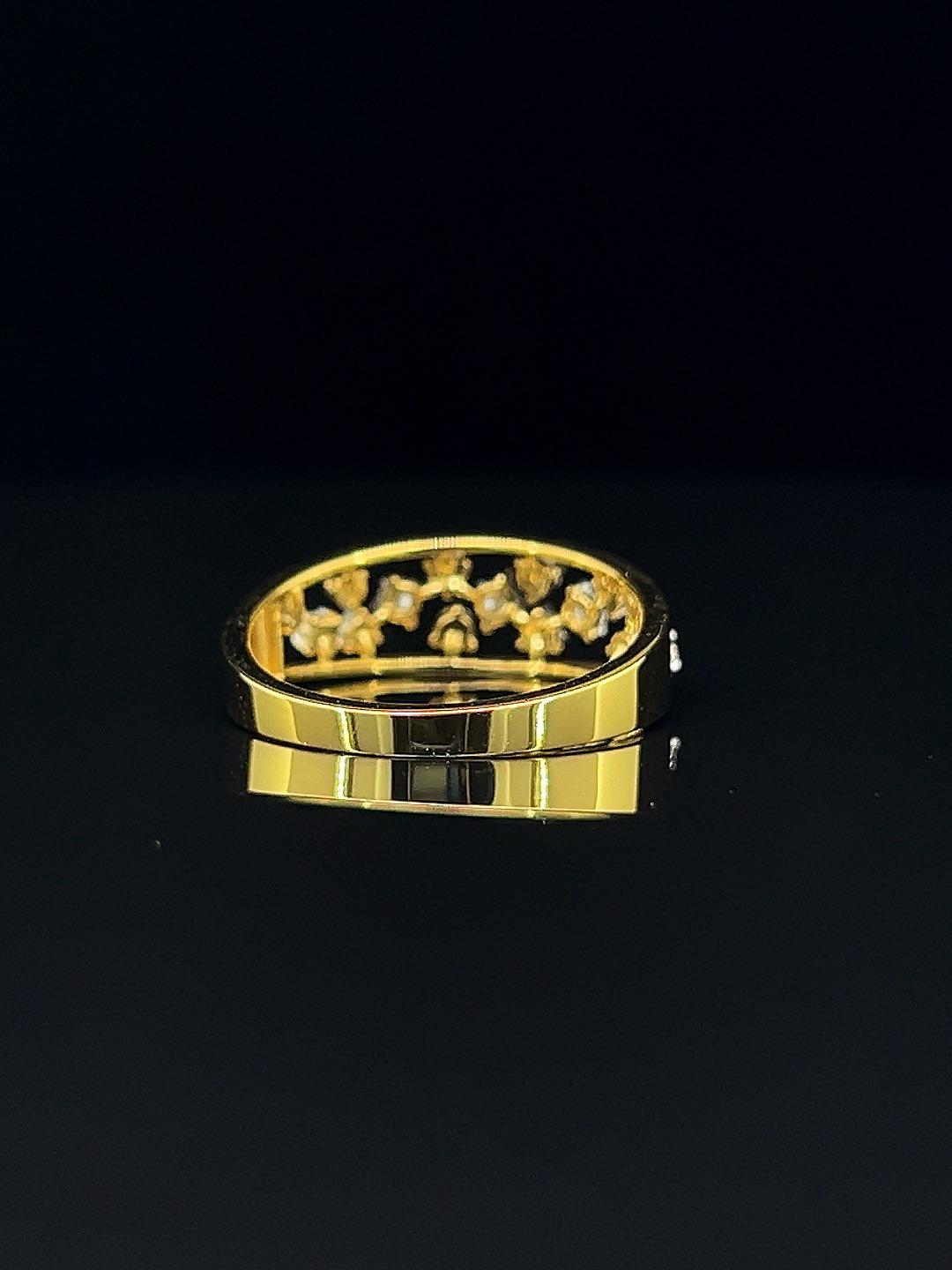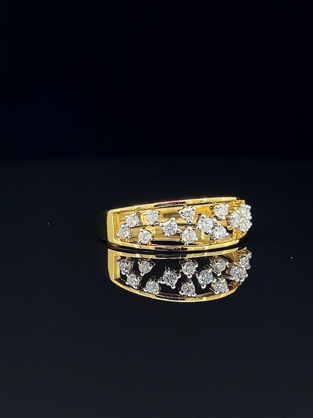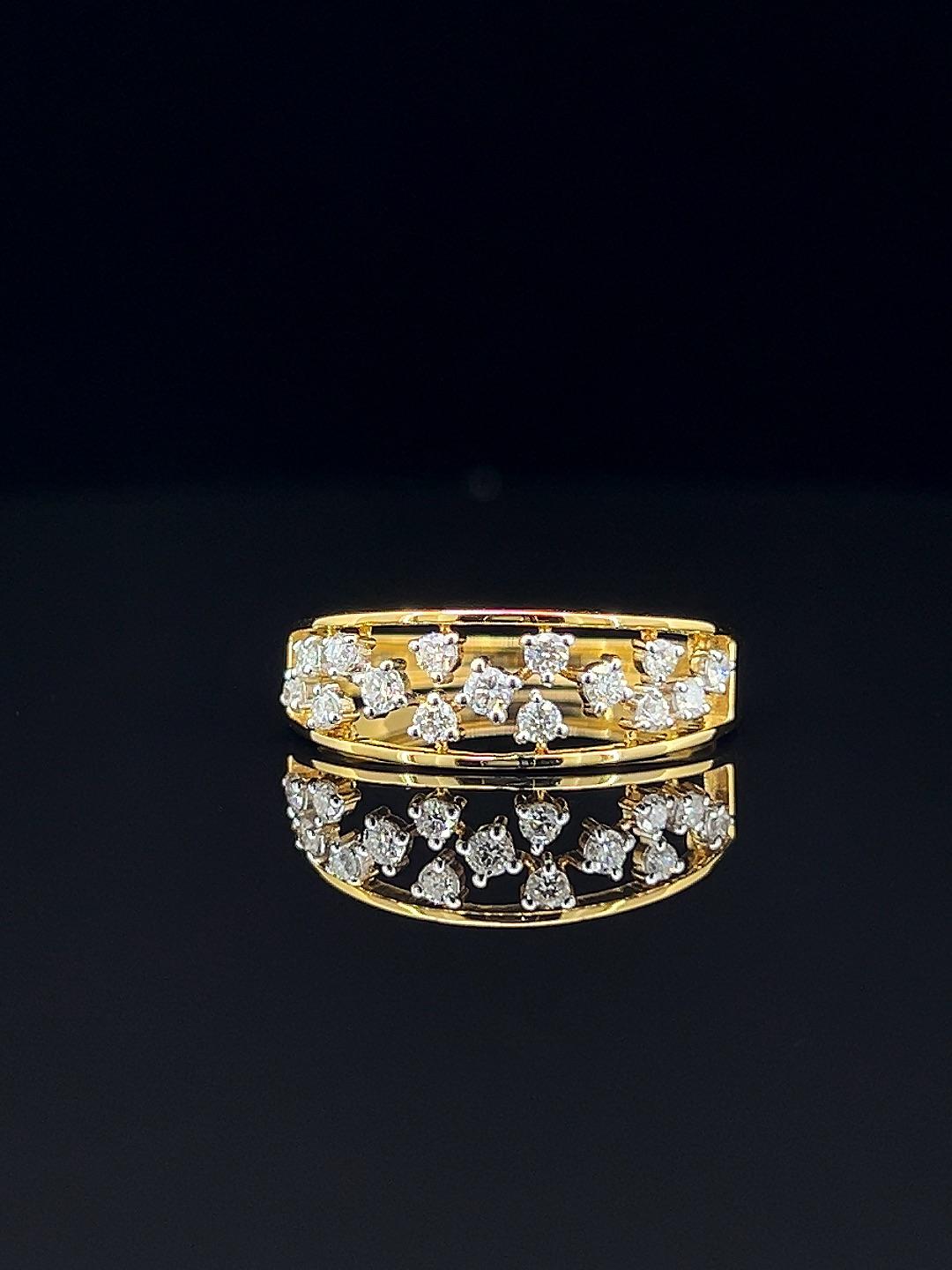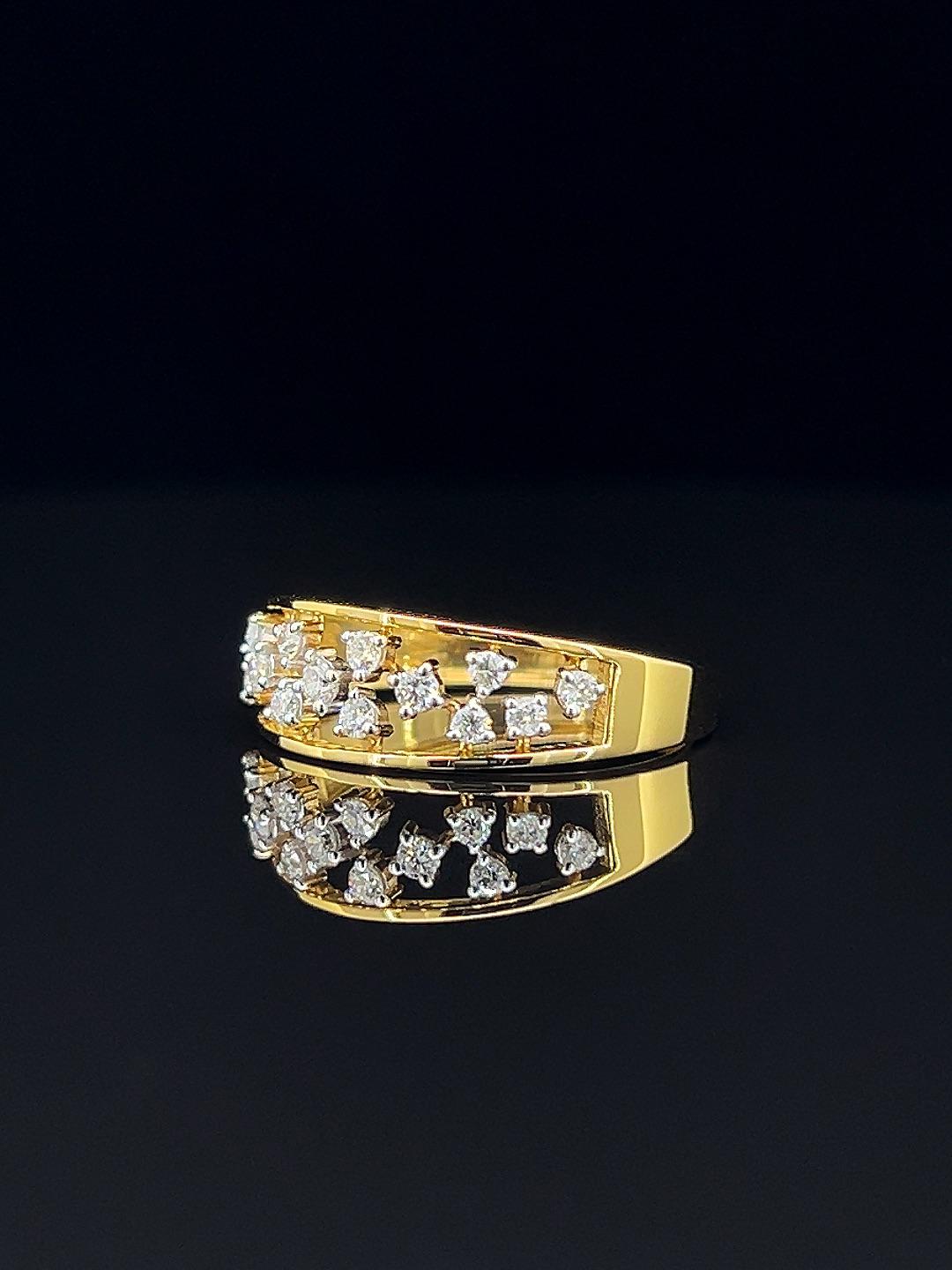 Experience harmony in design with the Golden Symphony diamond ring, a celebration of refined beauty and exceptional craftsmanship. This elegant double-band ring dazzles with rows of meticulously set round diamonds, each stone chosen for its clarity and brilliance. The openwork gold structure gives a modern twist to a classic silhouette, allowing the diamonds to dance effortlessly with light. Perfect for festive occasions or daily elegance, its secure fit and luxurious look make it a favorite for those who appreciate both style and substance. Whether as a meaningful gift or a personal indulgence, the Golden Symphony ring’s dual diamond bands create a symphony of sparkle and sophistication for every moment.