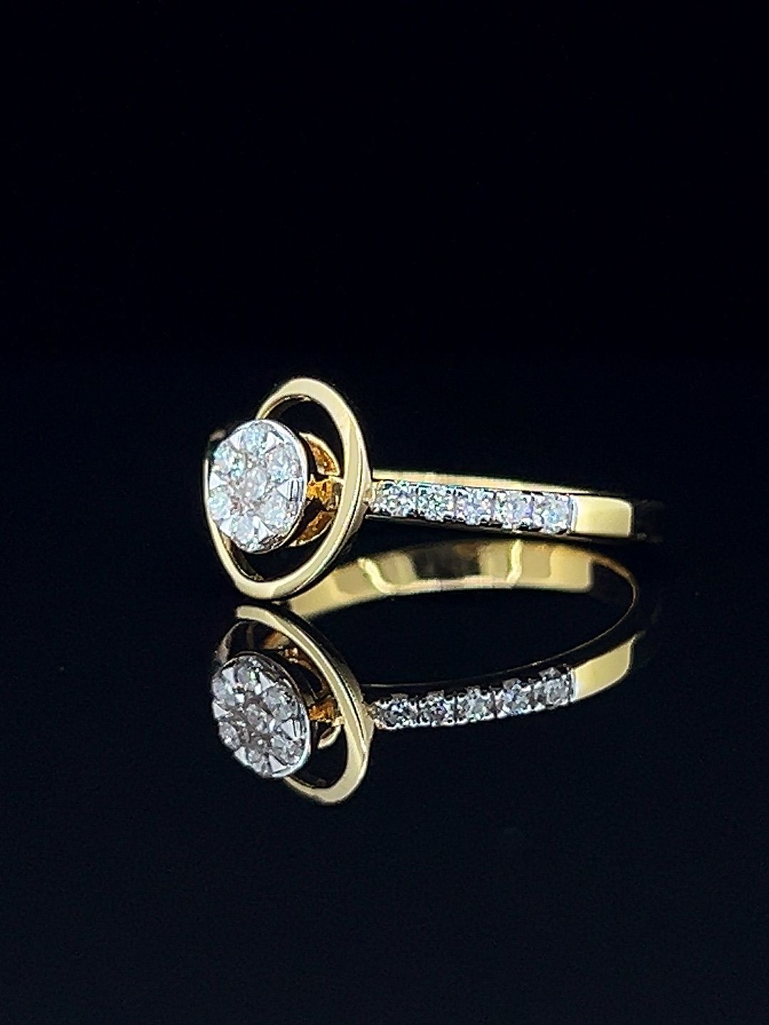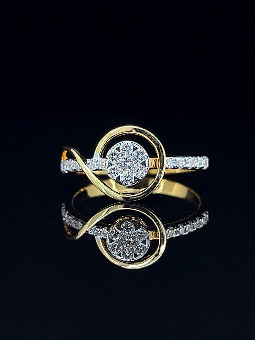 Infinite Grace diamond ring in gleaming gold, highlighted by a sparkling central diamond cluster and elegant swirl motif—capturing timeless beauty and refined style for any occasion.