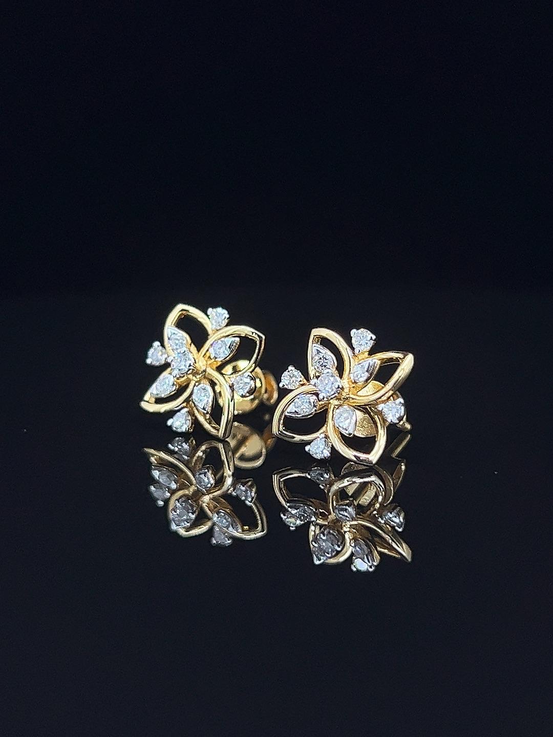 Lily Spark diamond earrings in polished gold, displaying open lily petal motifs accented with luminous diamonds—elegant, lightweight, and perfect for festive or daily wear.