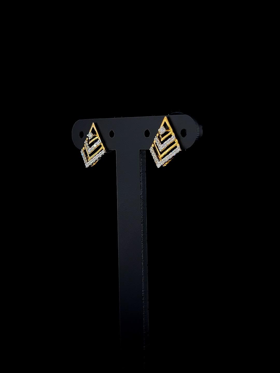 - Lumis Apex diamond earrings embody architectural precision and contemporary sophistication through their striking multi-tiered triangle design. Crafted in polished gold, each earring showcases three geometric layers with pavé diamond borders, culminating in a central diamond accent at the apex. The sharp angles and step-like structure deliver a dynamic, eye-catching silhouette, ideal for those who appreciate bold jewelry and artistic forms. Lightweight and comfortable, these earrings are excellent for festive events, evening glamour, or making a statement with everyday attire. The interplay of structure and sparkle celebrates both modern craftsmanship and wearable luxury, making Lumis Apex a perfect accessory for gifting or personal indulgence.