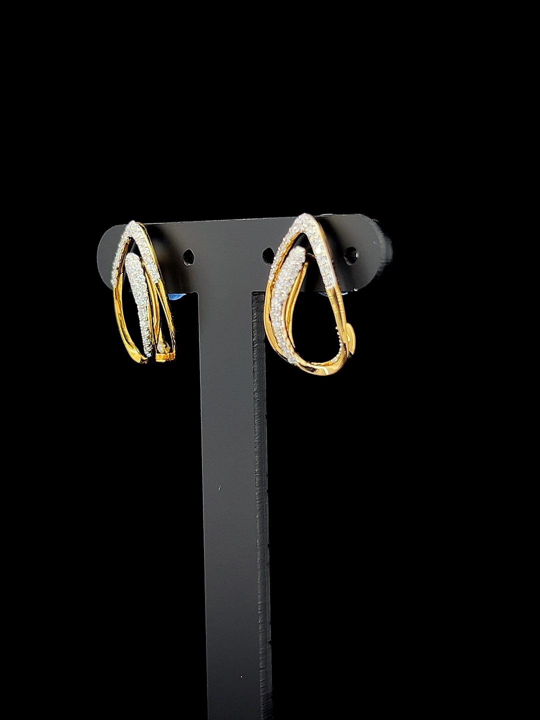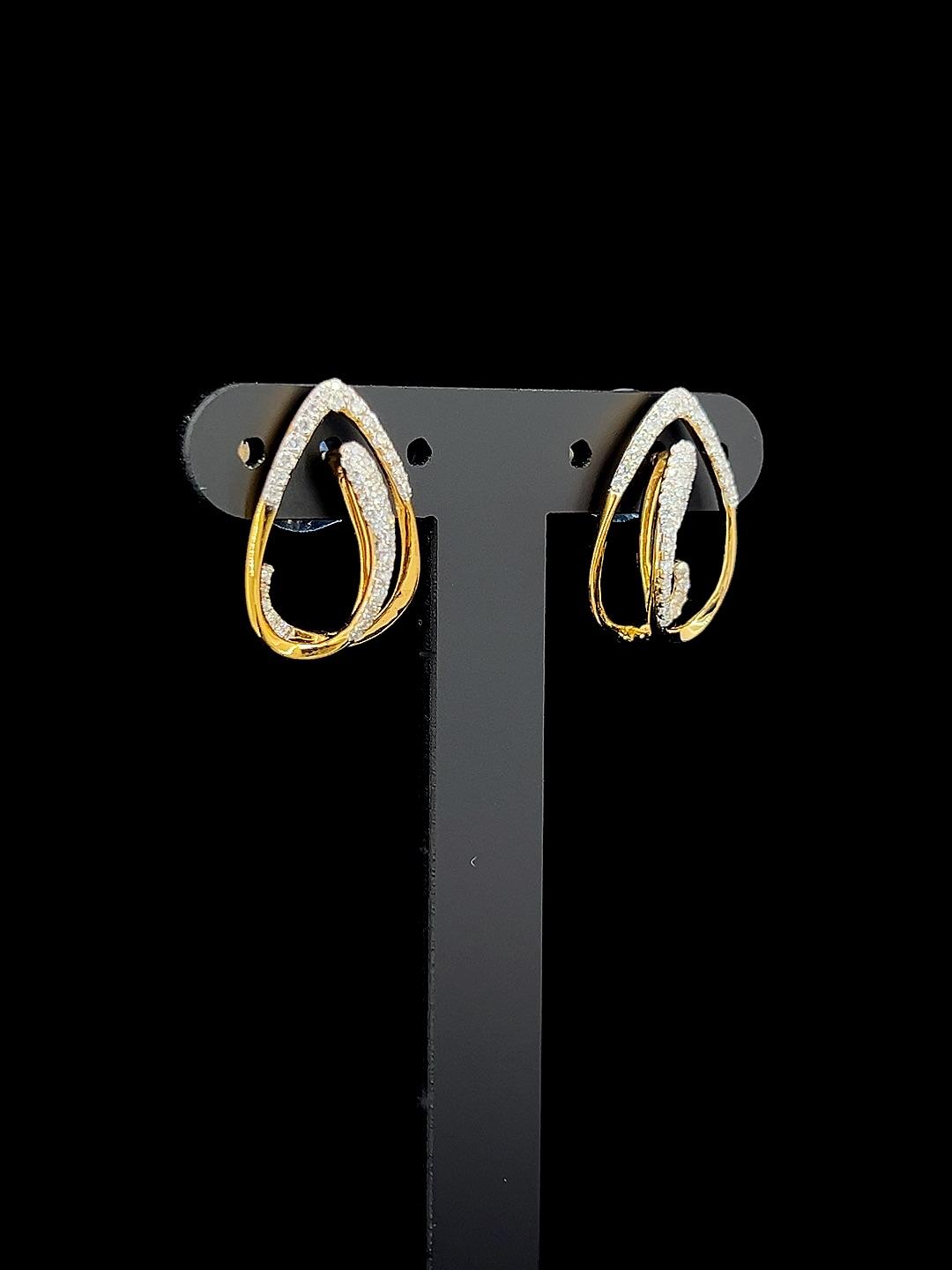 - Serene Loop diamond earrings combine fluid artistry and refined sparkle, featuring open teardrop-shaped gold frames accented with shimmering pavé diamonds. The unique inner sculptural loop creates visual depth and airy sophistication, giving these earrings a harmonious, contemporary flair. Lightweight yet impactful, the design is an ideal choice for festive occasions, gifting, or adding an elevated accent to a variety of outfits. Their versatile silhouette transitions seamlessly from ethnic to modern looks, ensuring lasting appeal and comfort. Serene Loop earrings celebrate the beauty of graceful curves and elegant detailing, perfect for those who appreciate understated luxury and timeless style.