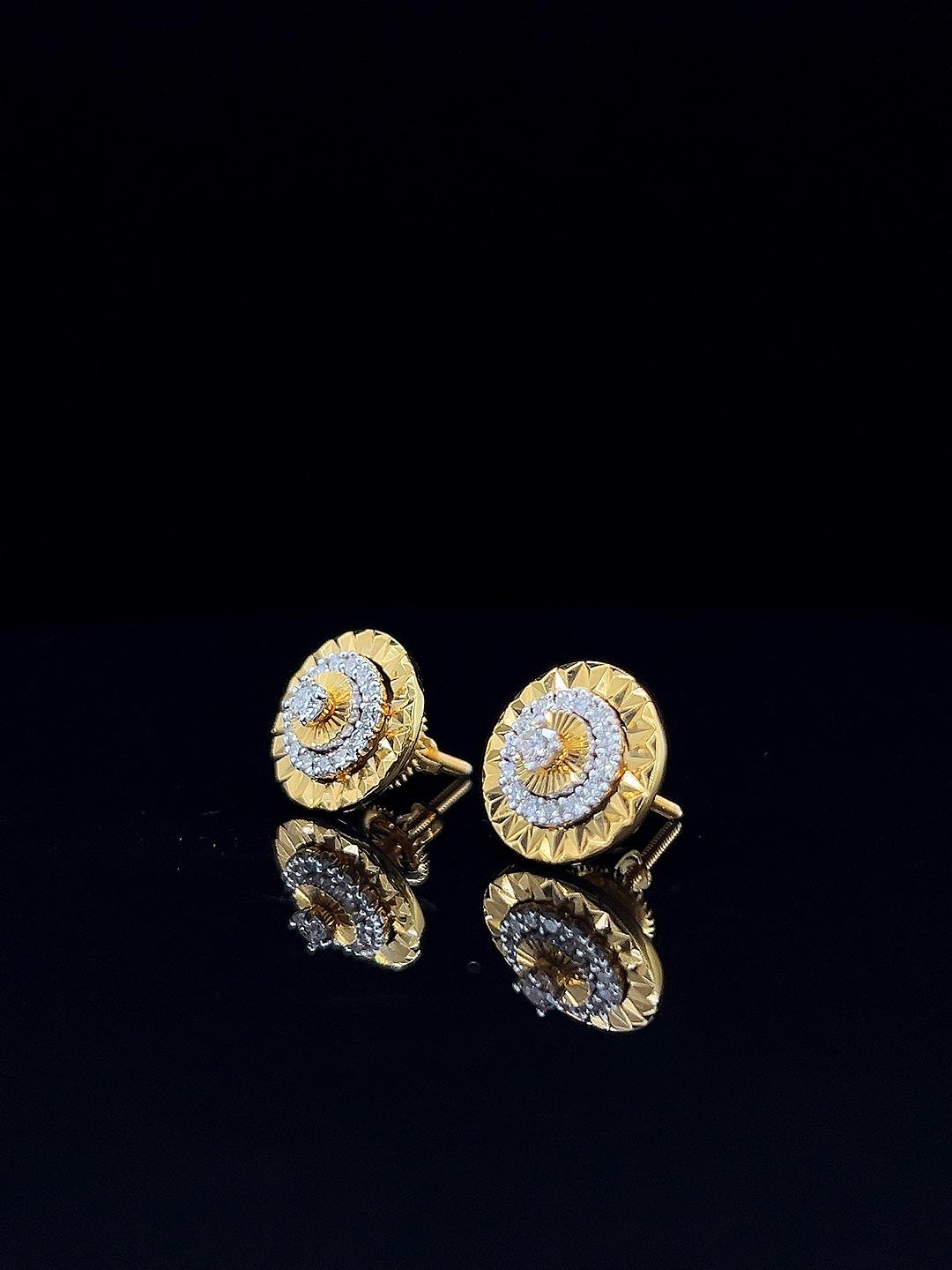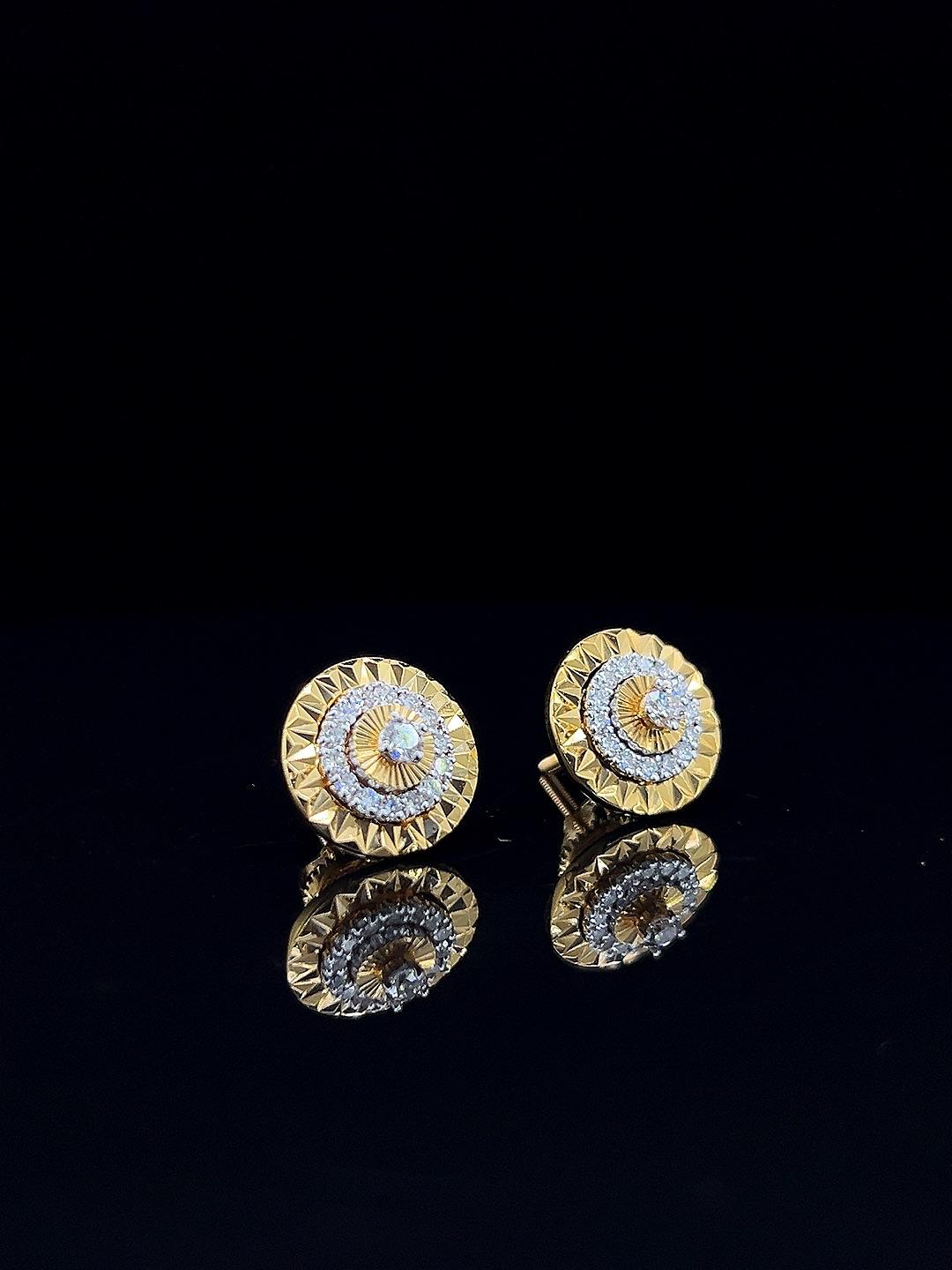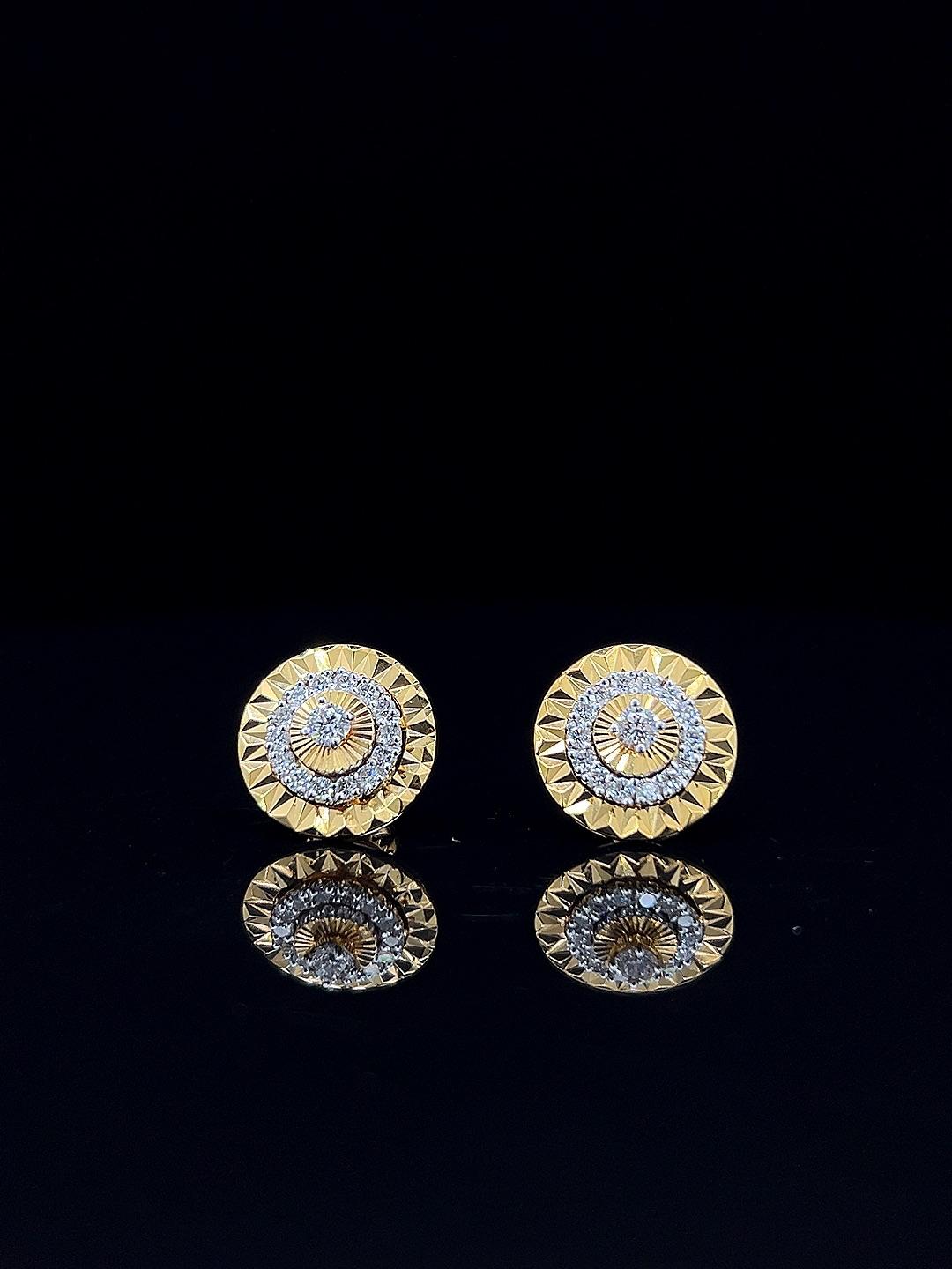 Suryamukhi Spark diamond studs in gleaming gold, with radiating sunburst textures and a sparkling diamond halo—bold, luminous, and perfect for festive occasions or daily brilliance.